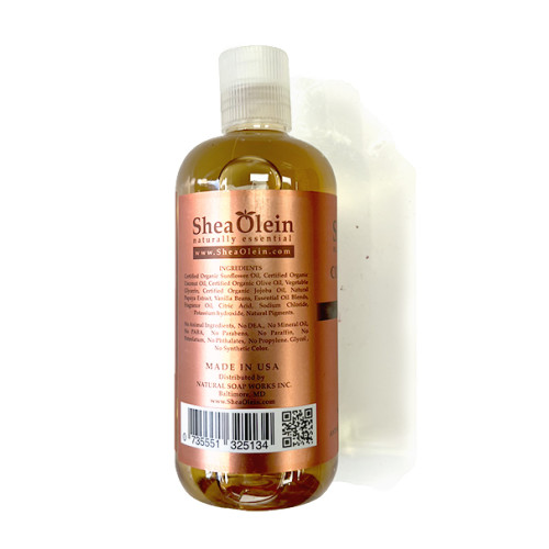 Ingredients: Certified Organic Sunflower Oil, Certified Organic Coconut Oil, Certified Organic Olive Oil, Vegetable Glycerin, Certified Organic Jojoba Oil, Natural Papaya Extract, Vanilla Beans, Essential Oil Blends, Fragrance Oil, Citric Acid, Sodium Chloride, Potassium Hydroxide, Natural Pigments. No Animal Ingredients, No DEA., No Mineral Oil, No PABA, No Parabens, No Paraffin, No Petrolatum, No Phthalates, No Propylene Glycol, No Synthetic Color.