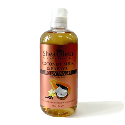Shea Olein’s certified organic Coconut Milk and Papaya Beauty Body Wash with Vanilla Bean Extract and tropical herbs promotes elasticity and a softer brighter skin. Coconut milk with Vitamin C and Copper helps to maintain skin elasticity and minimizes wrinkles and age spots. Papaya, which contains papain, a natural skin-brightening enzyme, that promotes skin renewal and cell turnover, along with Vanilla Bean’s anti-inflammatory properties promote a softer, brighter, smoother complexion.